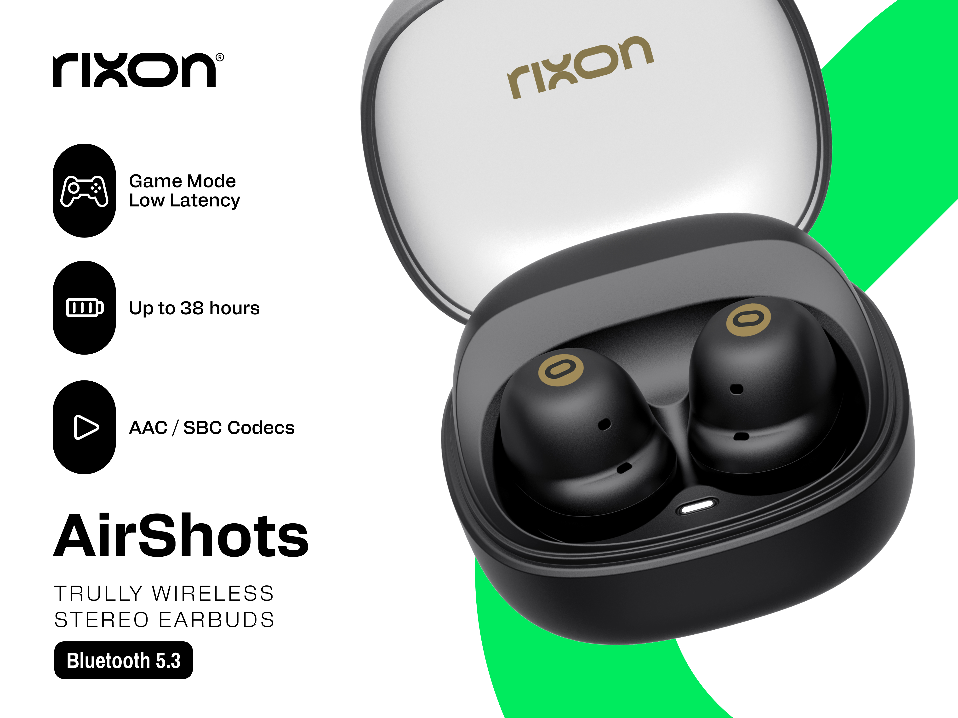 RIXON AirShots s bluetooth 5.3, výdrží až 38 hodin, minimální odezvou při hře a ochranou IPX4. Jdi si pro ně a buď si blíž. S kým a čím chceš.Bluetooth 5.3, výdrž až 38 hodin, minimální odezva při hře a ochrana IPX4. Navíc v zajímavém designovém pouzdru. Podpora AAC / SBC kodeku.