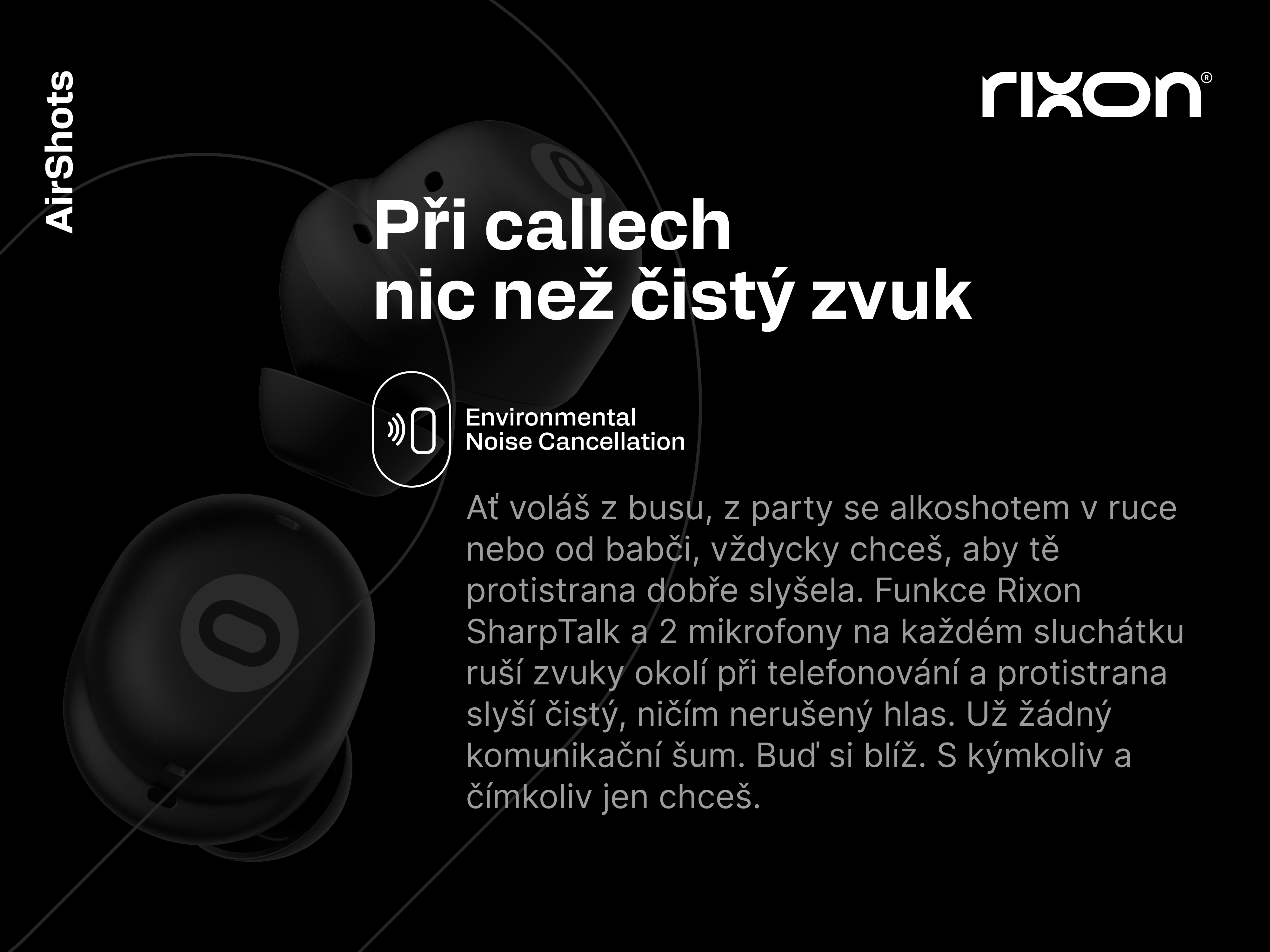 Ať voláš z busu, z party se alkoshotem v ruce nebo od babči, vždycky chceš, aby tě protistrana dobře slyšela. Funkce Rixon SharpTalk a 2 mikrofony na každém sluchátku ruší zvuky okolí při telefonování a protistrana slyší čistý, ničím nerušený hlas. Už žádný komunikační šum. Buď si blíž. S kýmkoliv a čímkoliv jen chceš.